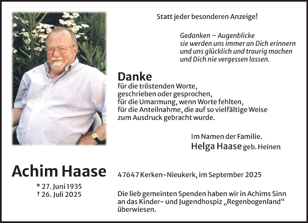 Hier finden Sie alle Traueranzeigen aus der Zeitung, die bisher für Achim Haase erschienen sind. Weitere Traueranzeigen, die in der Zeitung erscheinen, werden hier ebenfalls aufgelistet