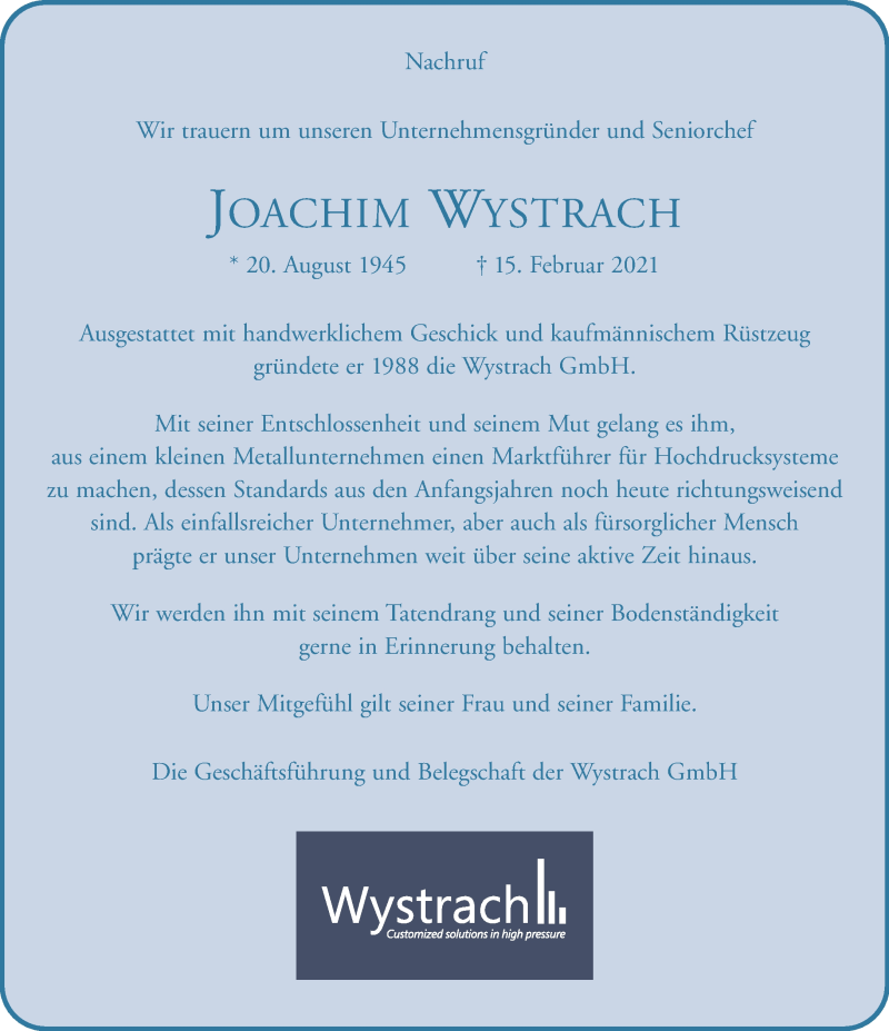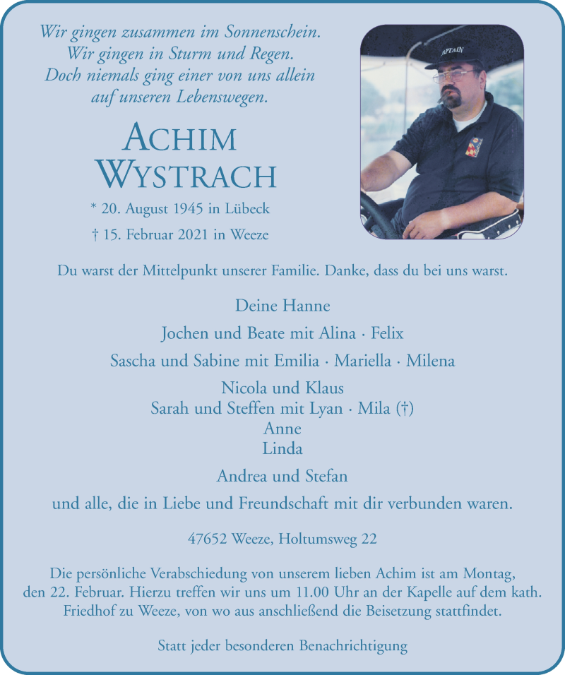 Hier finden Sie alle Traueranzeigen aus der Zeitung, die bisher für Achim Wystrach erschienen sind. Weitere Traueranzeigen, die in der Zeitung erscheinen, werden hier ebenfalls aufgelistet