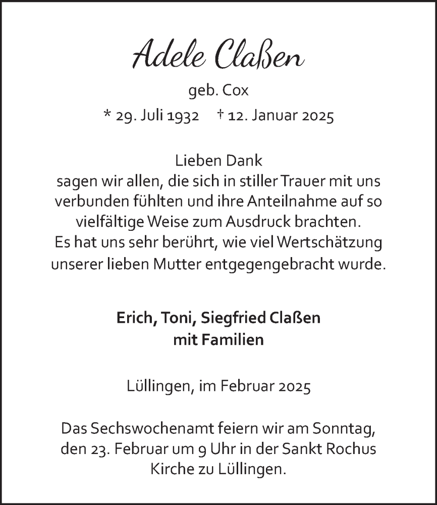 Hier finden Sie alle Traueranzeigen aus der Zeitung, die bisher für Adele Claßen erschienen sind. Weitere Traueranzeigen, die in der Zeitung erscheinen, werden hier ebenfalls aufgelistet