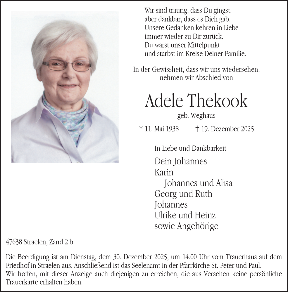 Hier finden Sie alle Traueranzeigen aus der Zeitung, die bisher für Adele Thekook erschienen sind. Weitere Traueranzeigen, die in der Zeitung erscheinen, werden hier ebenfalls aufgelistet
