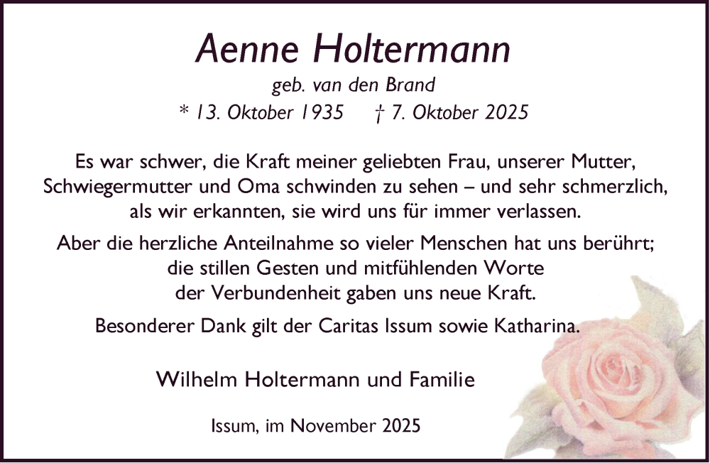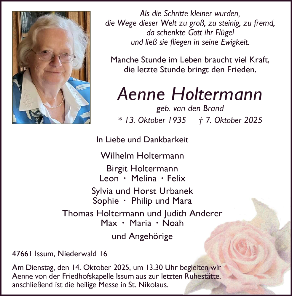 Hier finden Sie alle Traueranzeigen aus der Zeitung, die bisher für Aenne Holtermann erschienen sind. Weitere Traueranzeigen, die in der Zeitung erscheinen, werden hier ebenfalls aufgelistet
