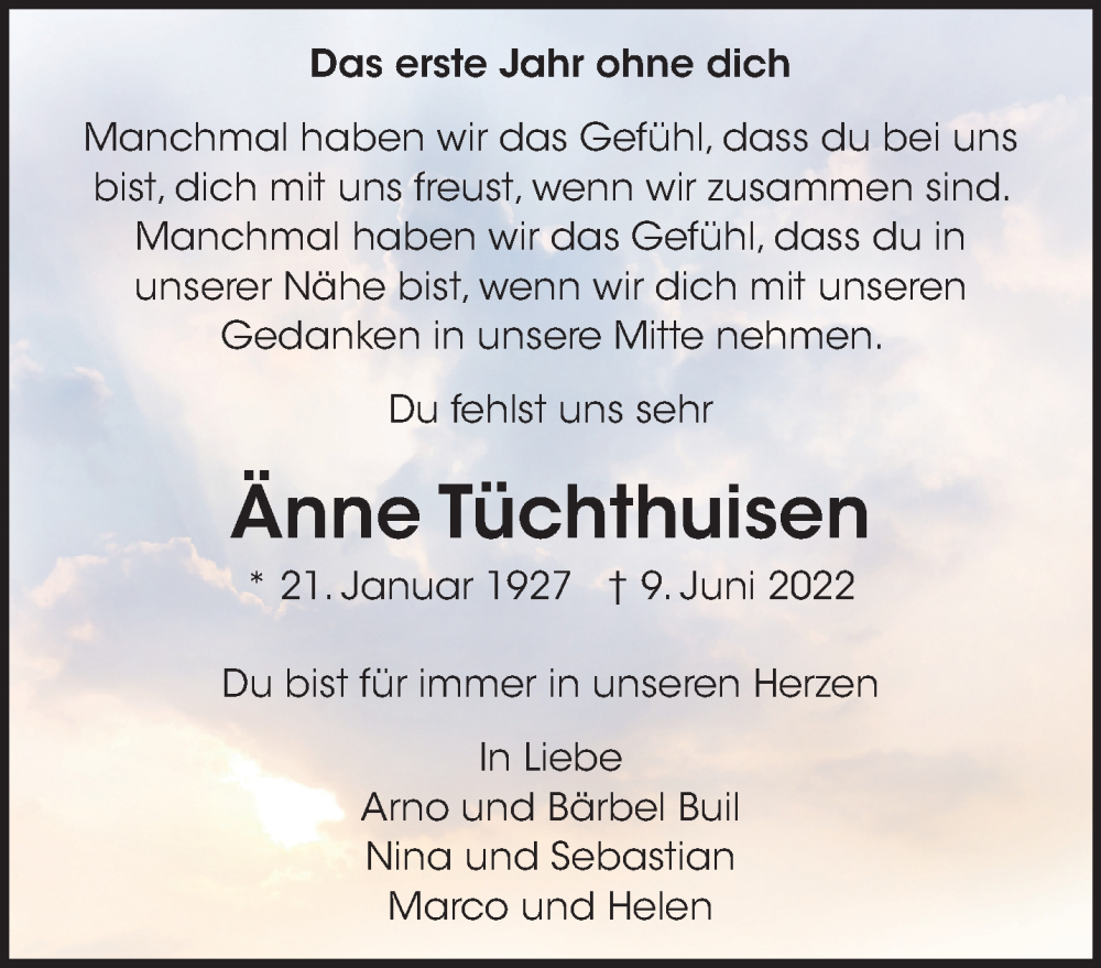 Hier finden Sie alle Traueranzeigen aus der Zeitung, die bisher für Änne Tüchthuisen erschienen sind. Weitere Traueranzeigen, die in der Zeitung erscheinen, werden hier ebenfalls aufgelistet
