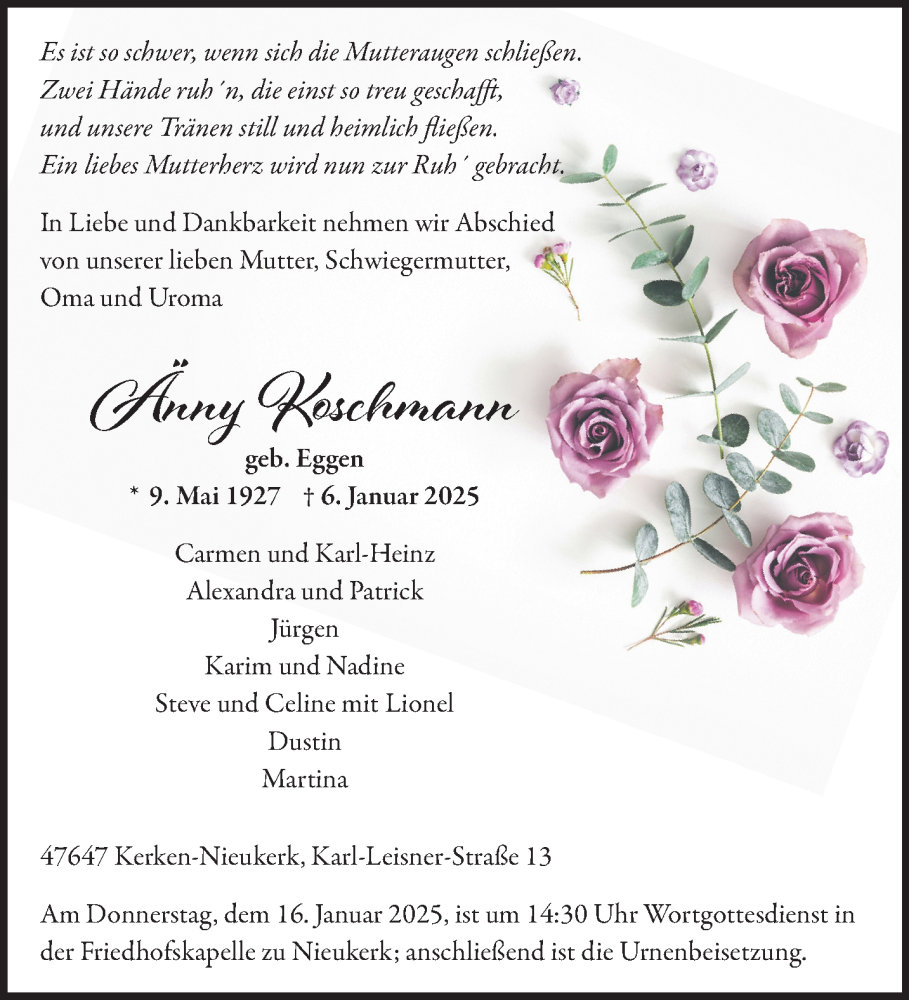 Hier finden Sie alle Traueranzeigen aus der Zeitung, die bisher für Änny Koschmann erschienen sind. Weitere Traueranzeigen, die in der Zeitung erscheinen, werden hier ebenfalls aufgelistet