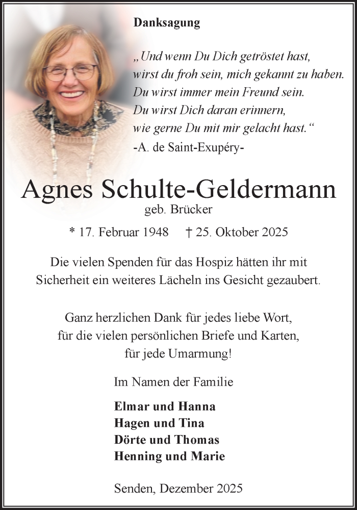 Hier finden Sie alle Traueranzeigen aus der Zeitung, die bisher für Agnes Schulte-Geldermann erschienen sind. Weitere Traueranzeigen, die in der Zeitung erscheinen, werden hier ebenfalls aufgelistet