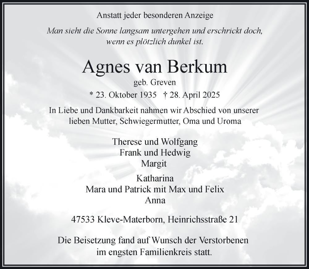 Hier finden Sie alle Traueranzeigen aus der Zeitung, die bisher für Agnes van Berkum erschienen sind. Weitere Traueranzeigen, die in der Zeitung erscheinen, werden hier ebenfalls aufgelistet