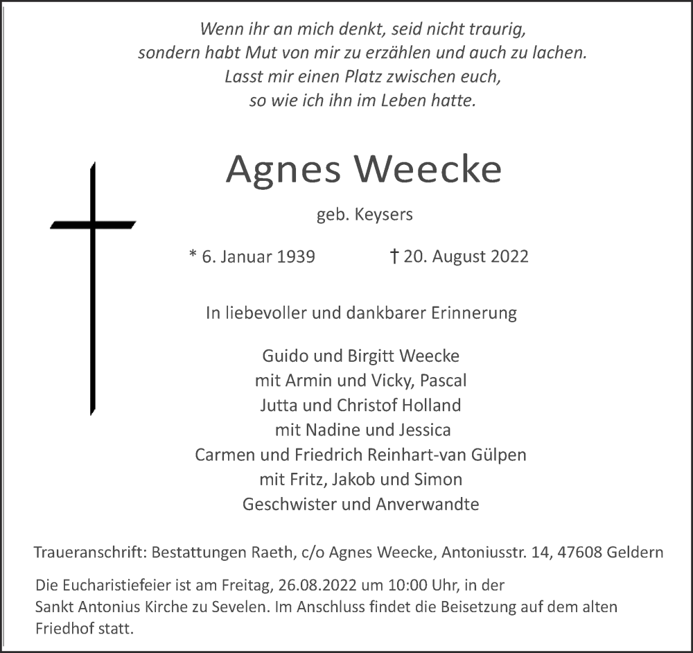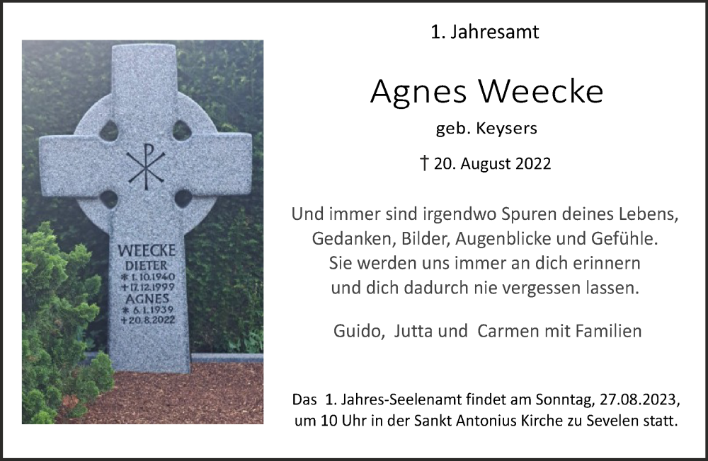 Hier finden Sie alle Traueranzeigen aus der Zeitung, die bisher für Agnes Weecke erschienen sind. Weitere Traueranzeigen, die in der Zeitung erscheinen, werden hier ebenfalls aufgelistet