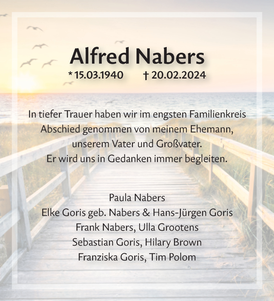 Hier finden Sie alle Traueranzeigen aus der Zeitung, die bisher für Alfred Nabers erschienen sind. Weitere Traueranzeigen, die in der Zeitung erscheinen, werden hier ebenfalls aufgelistet