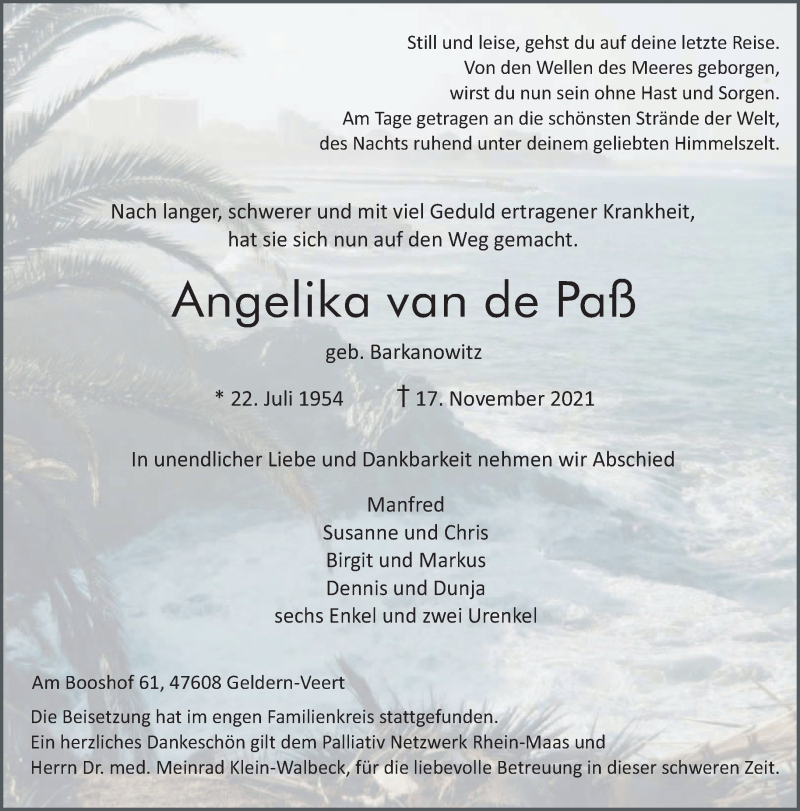 Hier finden Sie alle Traueranzeigen aus der Zeitung, die bisher für Angelika van dePaß erschienen sind. Weitere Traueranzeigen, die in der Zeitung erscheinen, werden hier ebenfalls aufgelistet