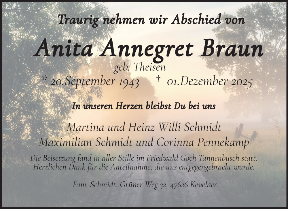 Hier finden Sie alle Traueranzeigen aus der Zeitung, die bisher für Anita Annegret Braun erschienen sind. Weitere Traueranzeigen, die in der Zeitung erscheinen, werden hier ebenfalls aufgelistet