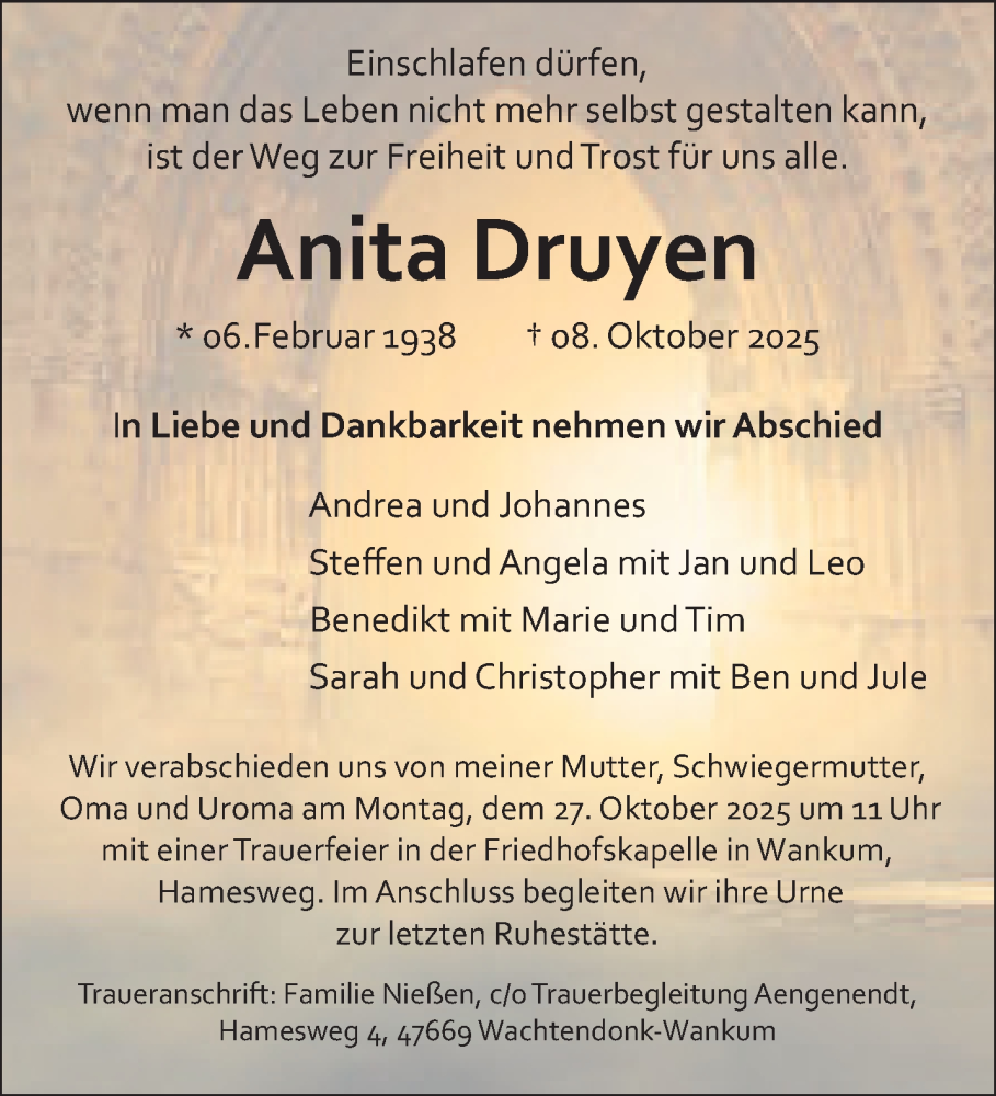 Hier finden Sie alle Traueranzeigen aus der Zeitung, die bisher für Anita Druyen erschienen sind. Weitere Traueranzeigen, die in der Zeitung erscheinen, werden hier ebenfalls aufgelistet