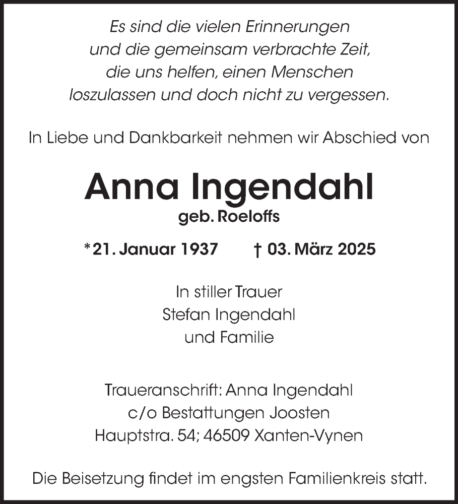 Hier finden Sie alle Traueranzeigen aus der Zeitung, die bisher für Anna Ingendahl erschienen sind. Weitere Traueranzeigen, die in der Zeitung erscheinen, werden hier ebenfalls aufgelistet