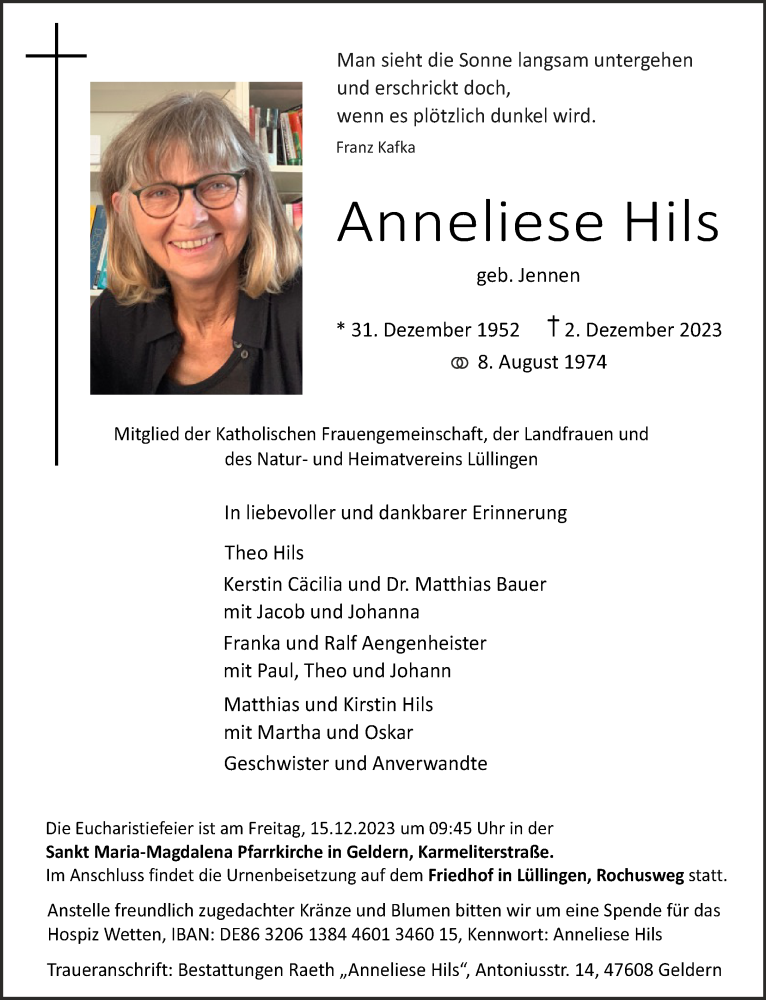Hier finden Sie alle Traueranzeigen aus der Zeitung, die bisher für Anneliese Hils erschienen sind. Weitere Traueranzeigen, die in der Zeitung erscheinen, werden hier ebenfalls aufgelistet