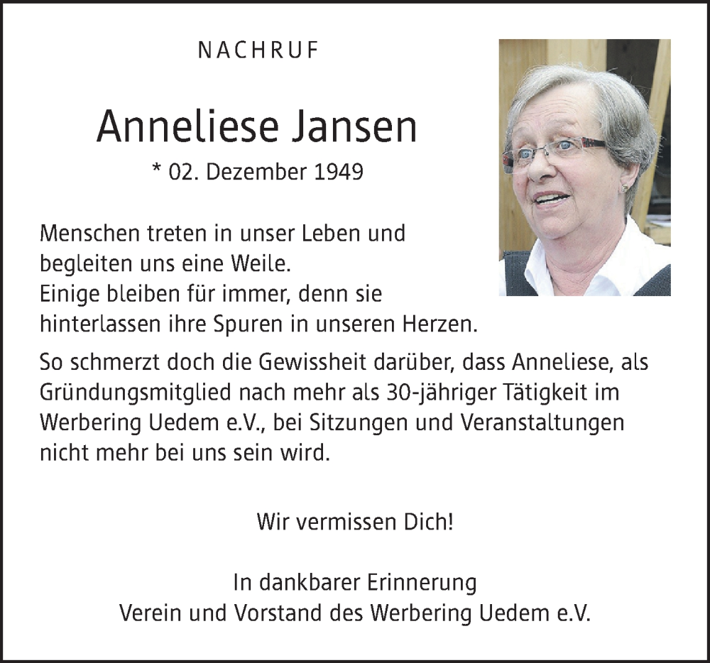 Hier finden Sie alle Traueranzeigen aus der Zeitung, die bisher für Anneliese Jansen erschienen sind. Weitere Traueranzeigen, die in der Zeitung erscheinen, werden hier ebenfalls aufgelistet