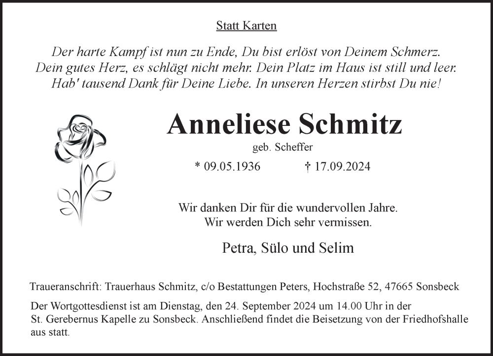 Hier finden Sie alle Traueranzeigen aus der Zeitung, die bisher für Anneliese Schmitz erschienen sind. Weitere Traueranzeigen, die in der Zeitung erscheinen, werden hier ebenfalls aufgelistet