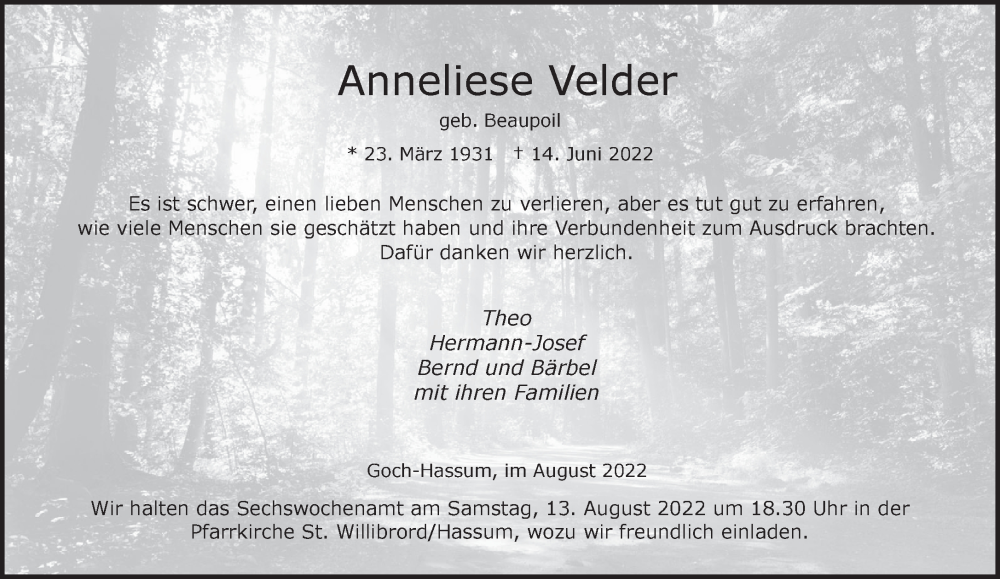 Hier finden Sie alle Traueranzeigen aus der Zeitung, die bisher für Anneliese Velder erschienen sind. Weitere Traueranzeigen, die in der Zeitung erscheinen, werden hier ebenfalls aufgelistet