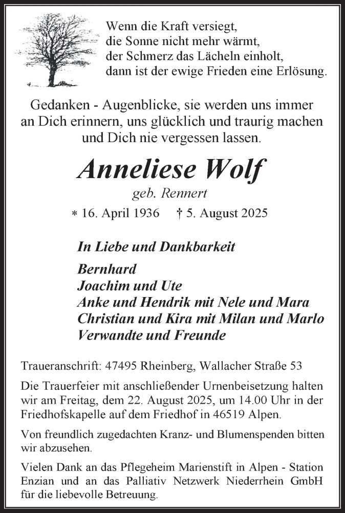 Hier finden Sie alle Traueranzeigen aus der Zeitung, die bisher für Anneliese Wolf erschienen sind. Weitere Traueranzeigen, die in der Zeitung erscheinen, werden hier ebenfalls aufgelistet
