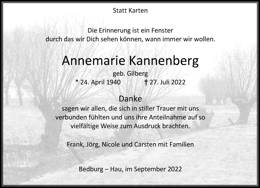 Hier finden Sie alle Traueranzeigen aus der Zeitung, die bisher für Annemarie Kannenberg erschienen sind. Weitere Traueranzeigen, die in der Zeitung erscheinen, werden hier ebenfalls aufgelistet
