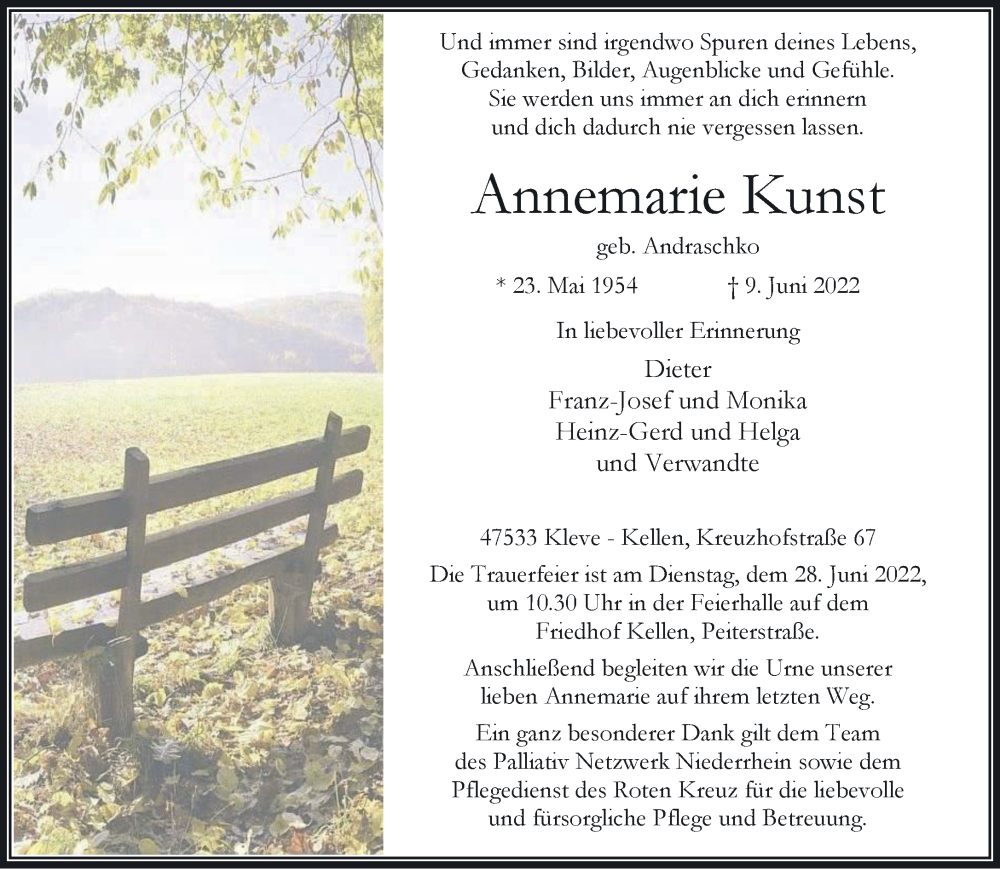 Hier finden Sie alle Traueranzeigen aus der Zeitung, die bisher für Annemarie Kunst erschienen sind. Weitere Traueranzeigen, die in der Zeitung erscheinen, werden hier ebenfalls aufgelistet