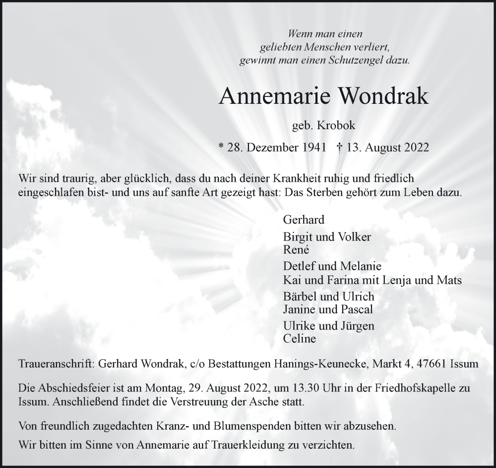 Hier finden Sie alle Traueranzeigen aus der Zeitung, die bisher für Annemarie Wondrak erschienen sind. Weitere Traueranzeigen, die in der Zeitung erscheinen, werden hier ebenfalls aufgelistet