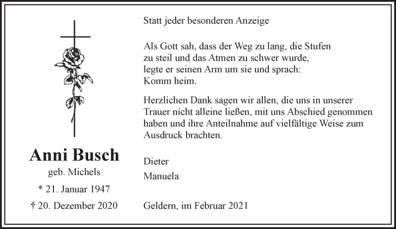 Hier finden Sie alle Traueranzeigen aus der Zeitung, die bisher für Anni Busch erschienen sind. Weitere Traueranzeigen, die in der Zeitung erscheinen, werden hier ebenfalls aufgelistet