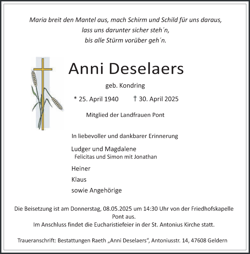Hier finden Sie alle Traueranzeigen aus der Zeitung, die bisher für Anni Deselaers erschienen sind. Weitere Traueranzeigen, die in der Zeitung erscheinen, werden hier ebenfalls aufgelistet