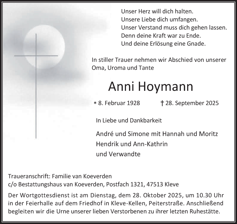 Hier finden Sie alle Traueranzeigen aus der Zeitung, die bisher für Anni Hoymann erschienen sind. Weitere Traueranzeigen, die in der Zeitung erscheinen, werden hier ebenfalls aufgelistet