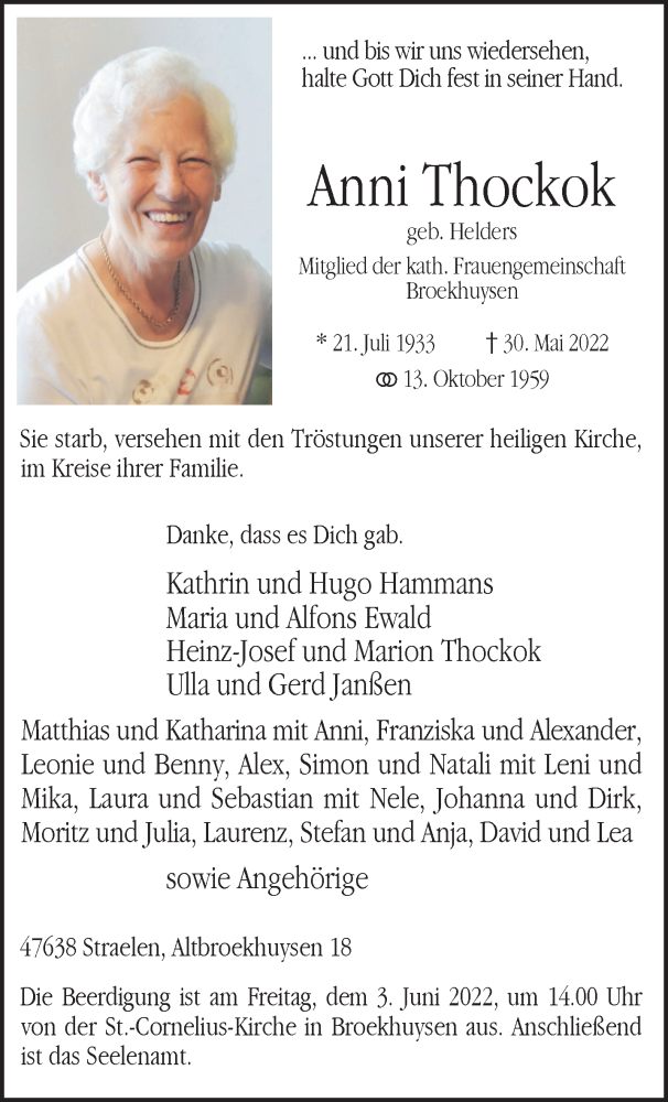 Hier finden Sie alle Traueranzeigen aus der Zeitung, die bisher für Anni Thockok erschienen sind. Weitere Traueranzeigen, die in der Zeitung erscheinen, werden hier ebenfalls aufgelistet