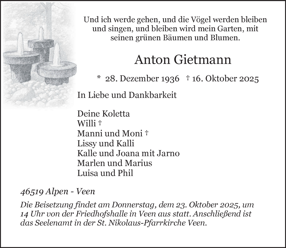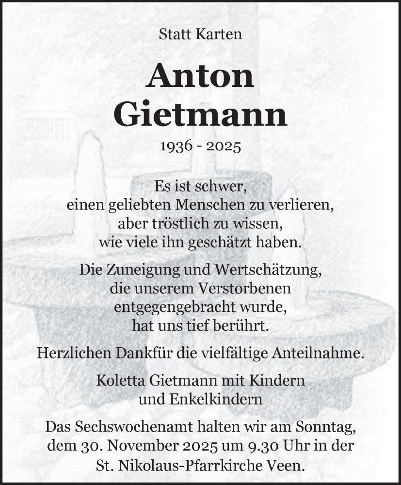 Hier finden Sie alle Traueranzeigen aus der Zeitung, die bisher für Anton Gietmann erschienen sind. Weitere Traueranzeigen, die in der Zeitung erscheinen, werden hier ebenfalls aufgelistet