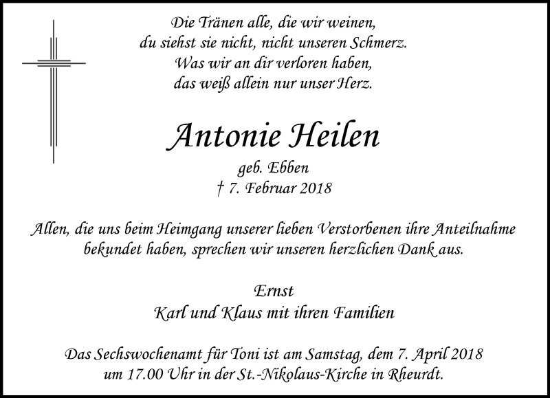 Hier finden Sie alle Traueranzeigen aus der Zeitung, die bisher für Anton Heilen erschienen sind. Weitere Traueranzeigen, die in der Zeitung erscheinen, werden hier ebenfalls aufgelistet