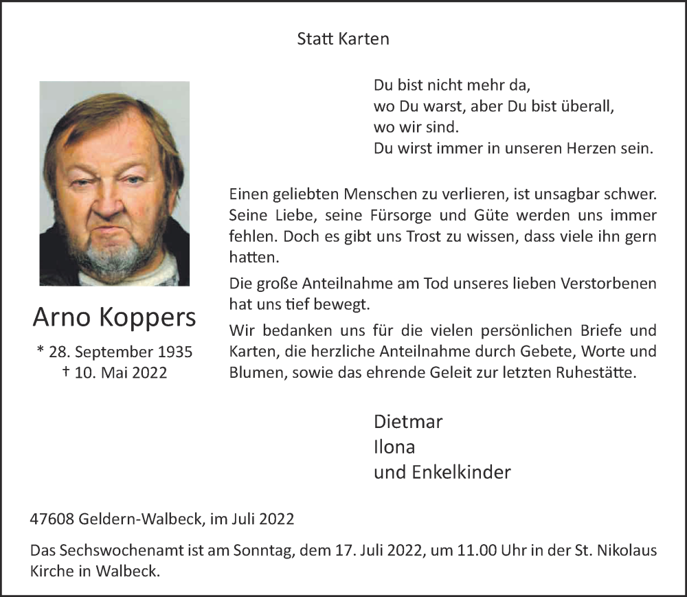 Hier finden Sie alle Traueranzeigen aus der Zeitung, die bisher für Arno Koppers erschienen sind. Weitere Traueranzeigen, die in der Zeitung erscheinen, werden hier ebenfalls aufgelistet