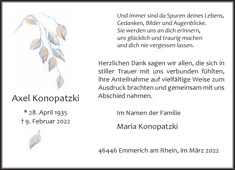 Hier finden Sie alle Traueranzeigen aus der Zeitung, die bisher für Axel Konopatzki erschienen sind. Weitere Traueranzeigen, die in der Zeitung erscheinen, werden hier ebenfalls aufgelistet