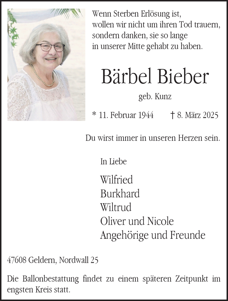 Hier finden Sie alle Traueranzeigen aus der Zeitung, die bisher für Bärbel Bieber erschienen sind. Weitere Traueranzeigen, die in der Zeitung erscheinen, werden hier ebenfalls aufgelistet