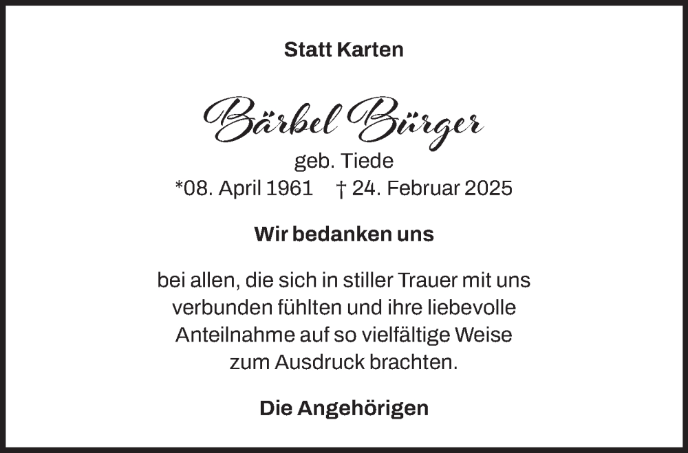 Hier finden Sie alle Traueranzeigen aus der Zeitung, die bisher für Bärbel Bürger erschienen sind. Weitere Traueranzeigen, die in der Zeitung erscheinen, werden hier ebenfalls aufgelistet