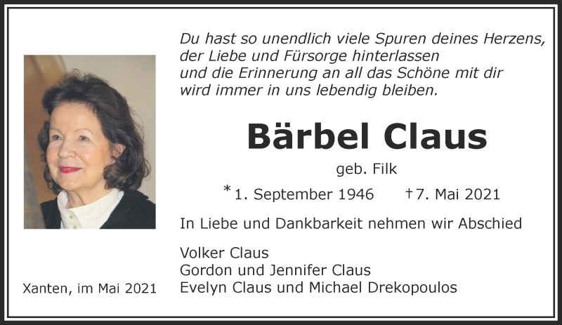 Hier finden Sie alle Traueranzeigen aus der Zeitung, die bisher für Bärbel Claus erschienen sind. Weitere Traueranzeigen, die in der Zeitung erscheinen, werden hier ebenfalls aufgelistet