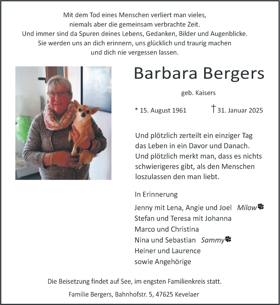 Hier finden Sie alle Traueranzeigen aus der Zeitung, die bisher für Barbara Bergers erschienen sind. Weitere Traueranzeigen, die in der Zeitung erscheinen, werden hier ebenfalls aufgelistet