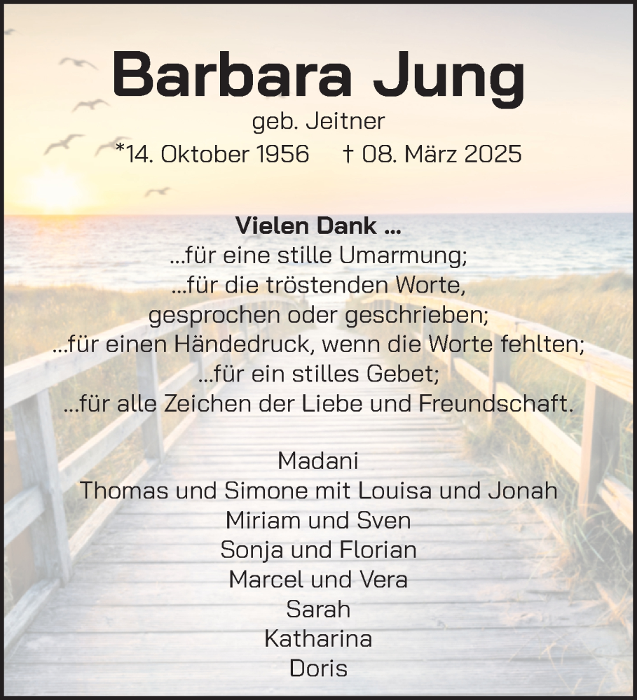 Hier finden Sie alle Traueranzeigen aus der Zeitung, die bisher für Barbara Jung erschienen sind. Weitere Traueranzeigen, die in der Zeitung erscheinen, werden hier ebenfalls aufgelistet