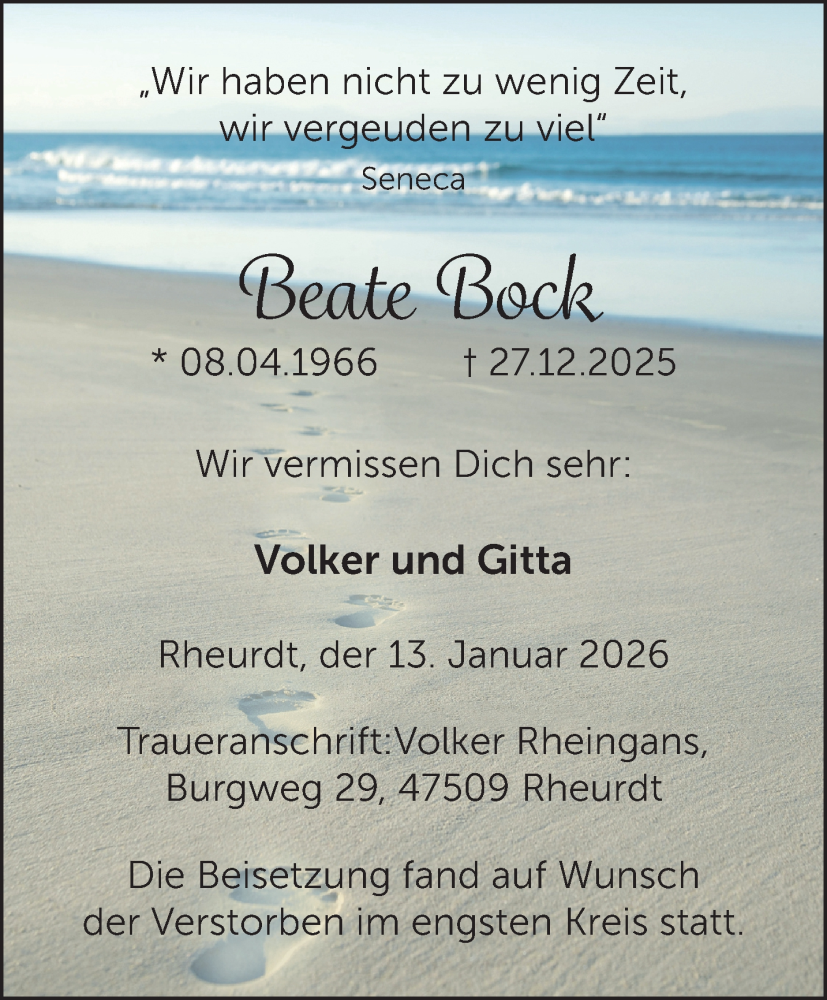 Hier finden Sie alle Traueranzeigen aus der Zeitung, die bisher für Beate Bock erschienen sind. Weitere Traueranzeigen, die in der Zeitung erscheinen, werden hier ebenfalls aufgelistet