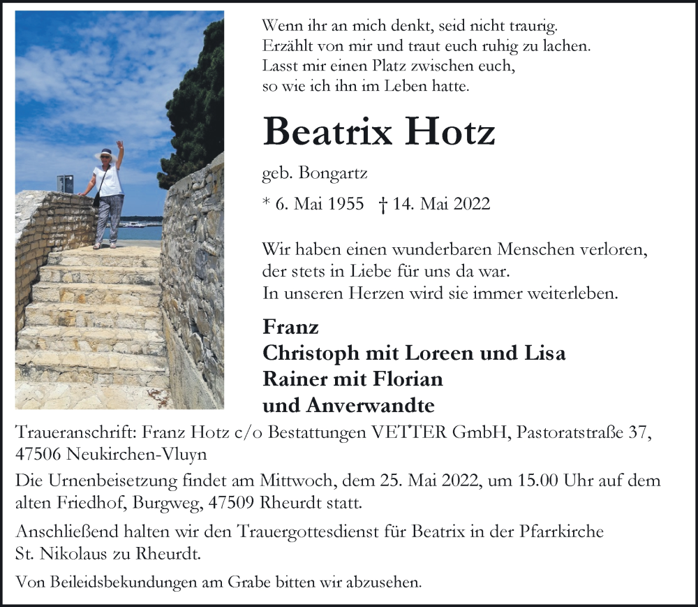 Hier finden Sie alle Traueranzeigen aus der Zeitung, die bisher für Beatrix Hotz erschienen sind. Weitere Traueranzeigen, die in der Zeitung erscheinen, werden hier ebenfalls aufgelistet