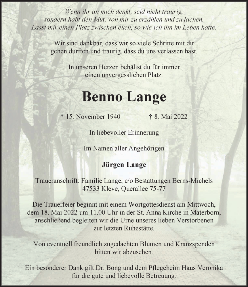 Hier finden Sie alle Traueranzeigen aus der Zeitung, die bisher für Benno Lange erschienen sind. Weitere Traueranzeigen, die in der Zeitung erscheinen, werden hier ebenfalls aufgelistet