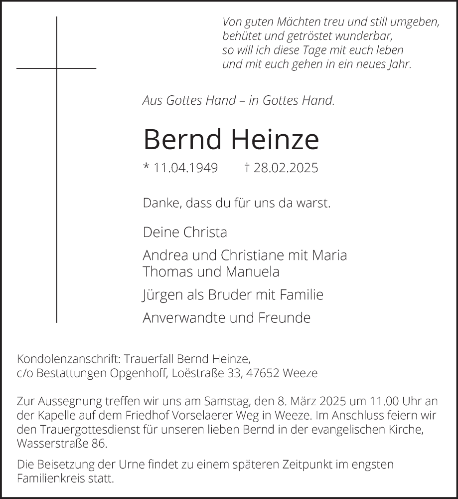 Hier finden Sie alle Traueranzeigen aus der Zeitung, die bisher für Bernd Heinze erschienen sind. Weitere Traueranzeigen, die in der Zeitung erscheinen, werden hier ebenfalls aufgelistet