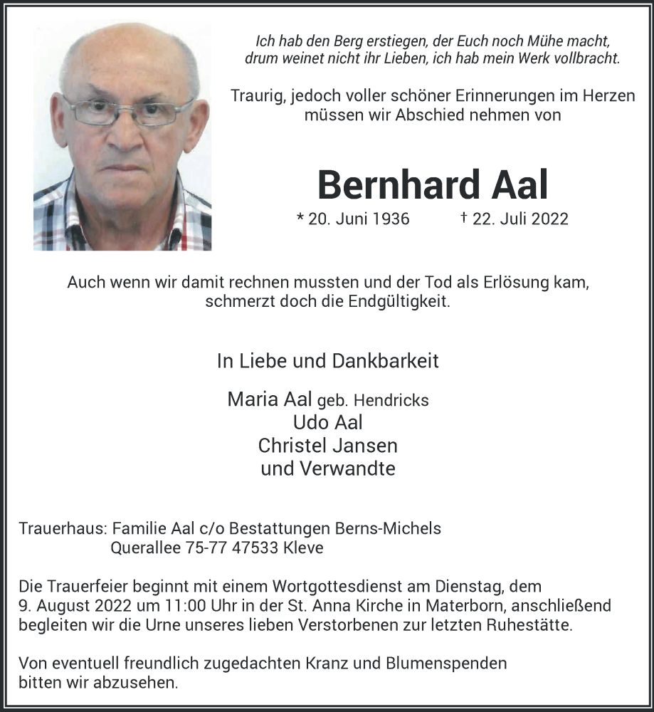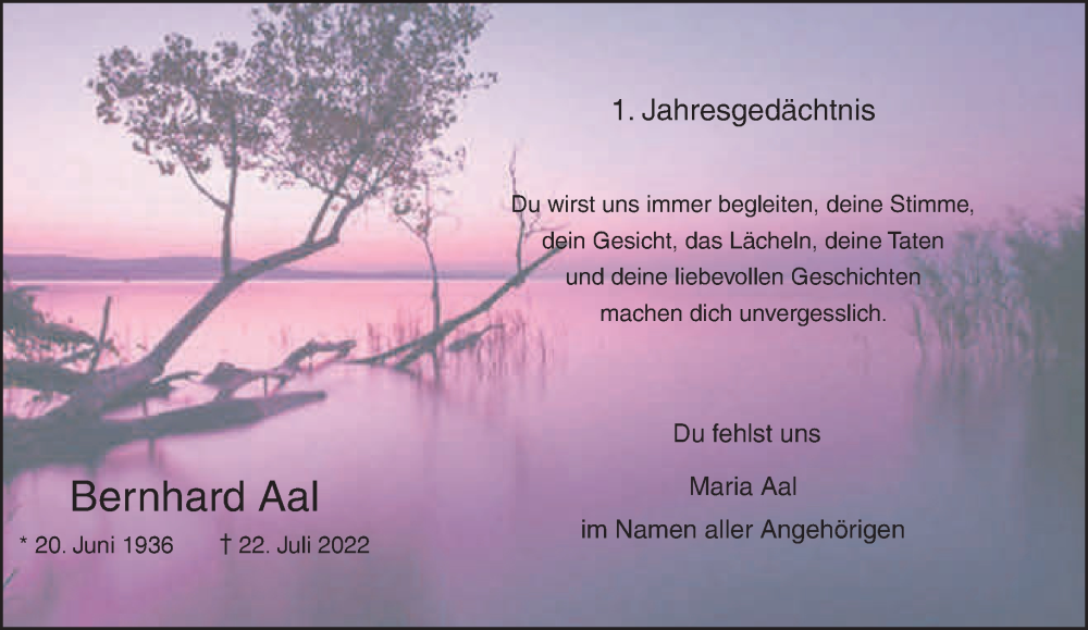 Hier finden Sie alle Traueranzeigen aus der Zeitung, die bisher für Bernhard Aal erschienen sind. Weitere Traueranzeigen, die in der Zeitung erscheinen, werden hier ebenfalls aufgelistet