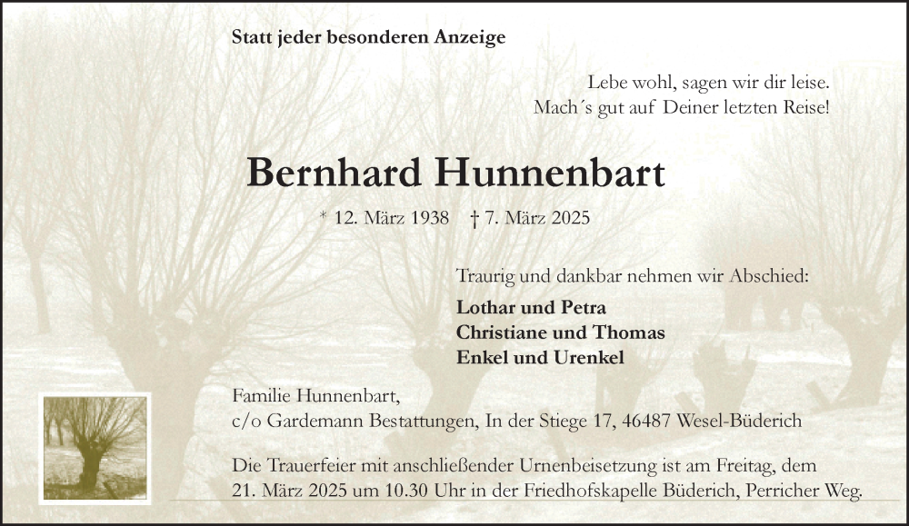 Hier finden Sie alle Traueranzeigen aus der Zeitung, die bisher für Bernhard Hunnenbart erschienen sind. Weitere Traueranzeigen, die in der Zeitung erscheinen, werden hier ebenfalls aufgelistet