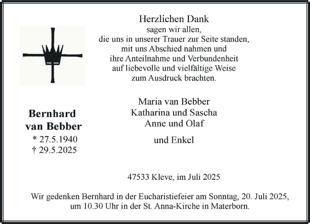 Hier finden Sie alle Traueranzeigen aus der Zeitung, die bisher für Bernhard van Bebber erschienen sind. Weitere Traueranzeigen, die in der Zeitung erscheinen, werden hier ebenfalls aufgelistet