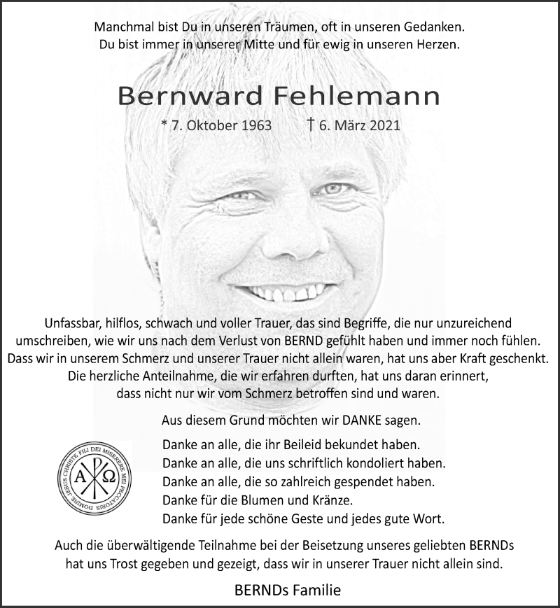 Hier finden Sie alle Traueranzeigen aus der Zeitung, die bisher für Bernward Fehlemann erschienen sind. Weitere Traueranzeigen, die in der Zeitung erscheinen, werden hier ebenfalls aufgelistet