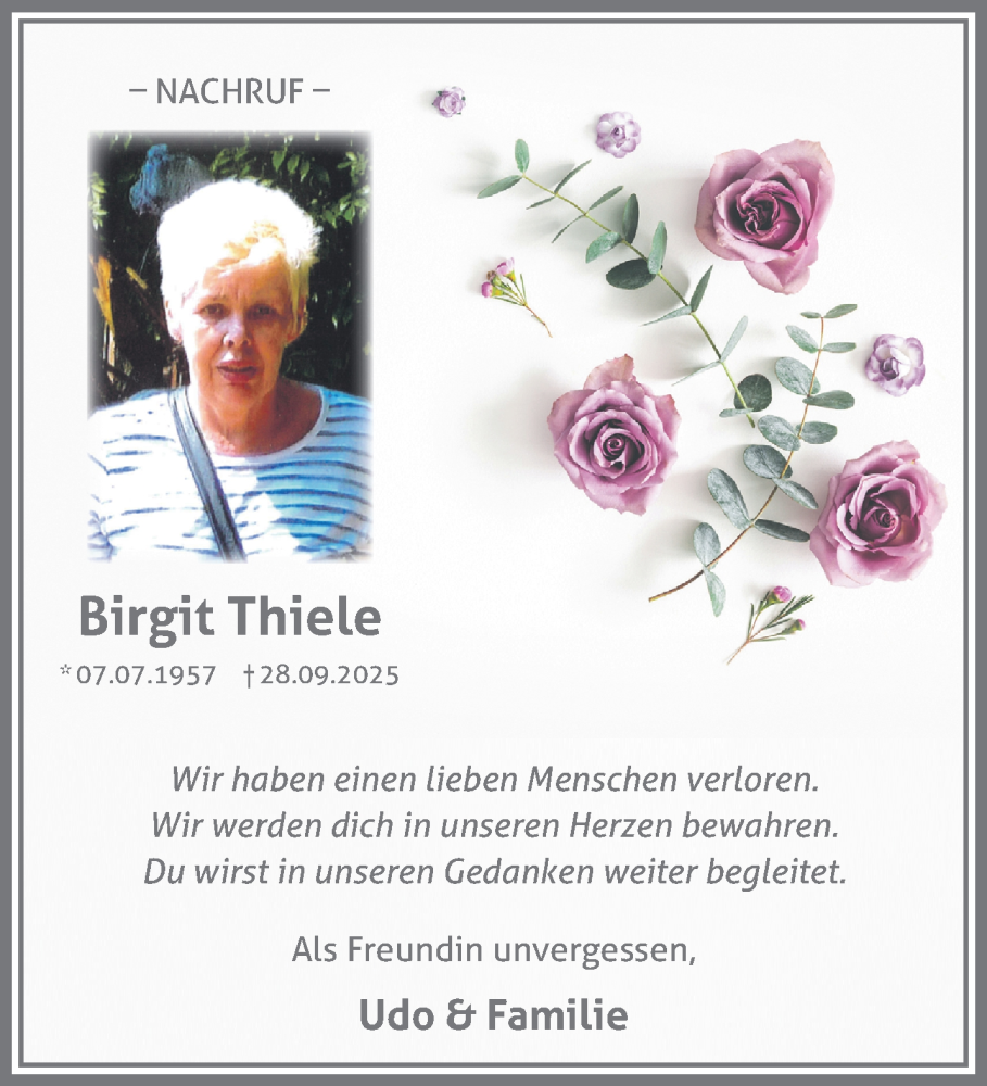 Hier finden Sie alle Traueranzeigen aus der Zeitung, die bisher für Birgit Thiele erschienen sind. Weitere Traueranzeigen, die in der Zeitung erscheinen, werden hier ebenfalls aufgelistet