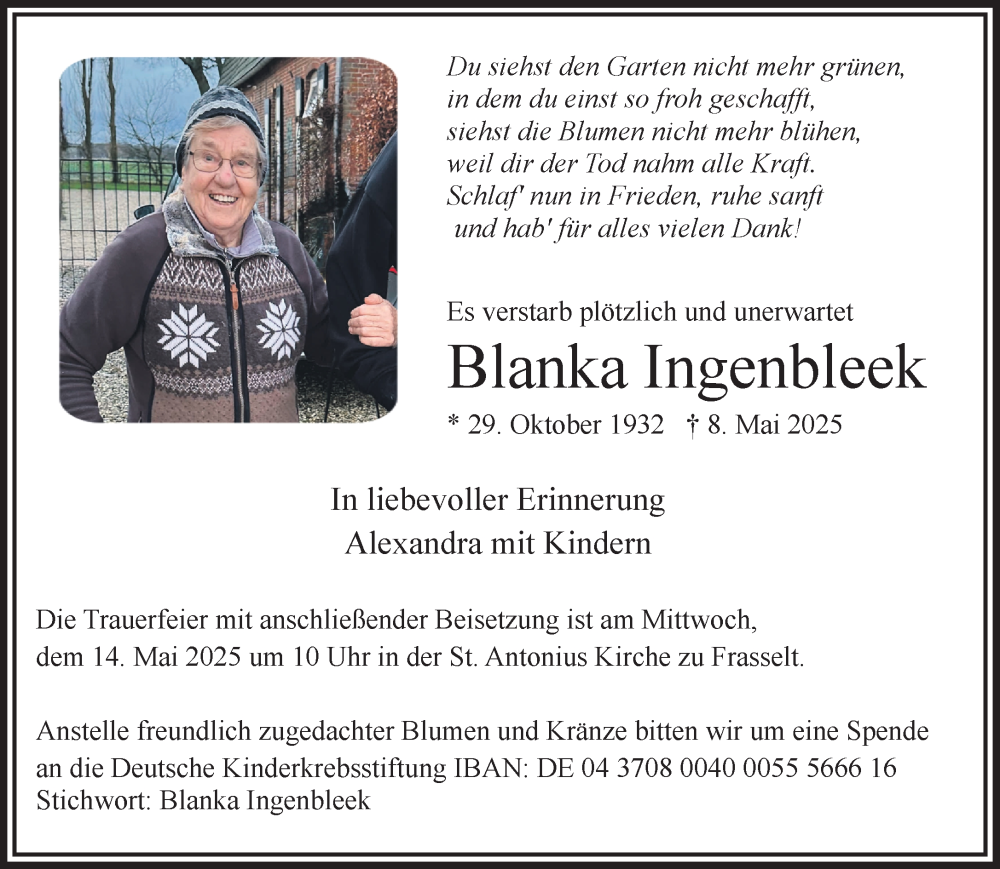 Hier finden Sie alle Traueranzeigen aus der Zeitung, die bisher für Blanka Ingenbleek erschienen sind. Weitere Traueranzeigen, die in der Zeitung erscheinen, werden hier ebenfalls aufgelistet