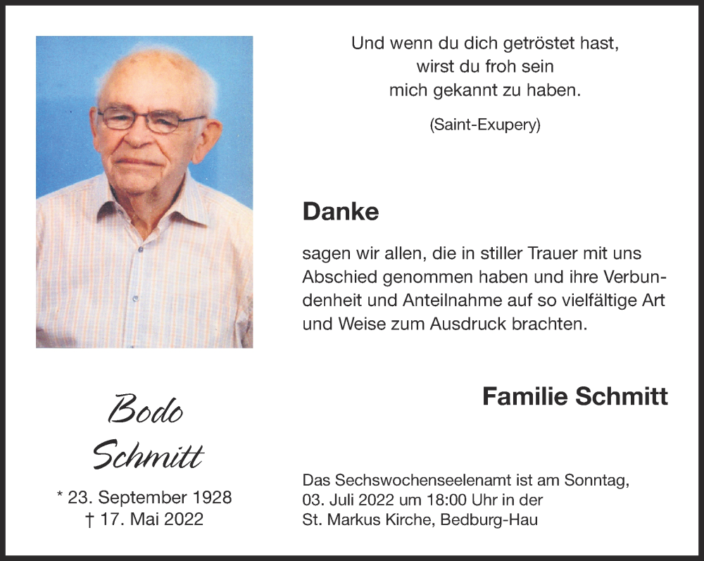 Hier finden Sie alle Traueranzeigen aus der Zeitung, die bisher für Bodo Schmitt erschienen sind. Weitere Traueranzeigen, die in der Zeitung erscheinen, werden hier ebenfalls aufgelistet