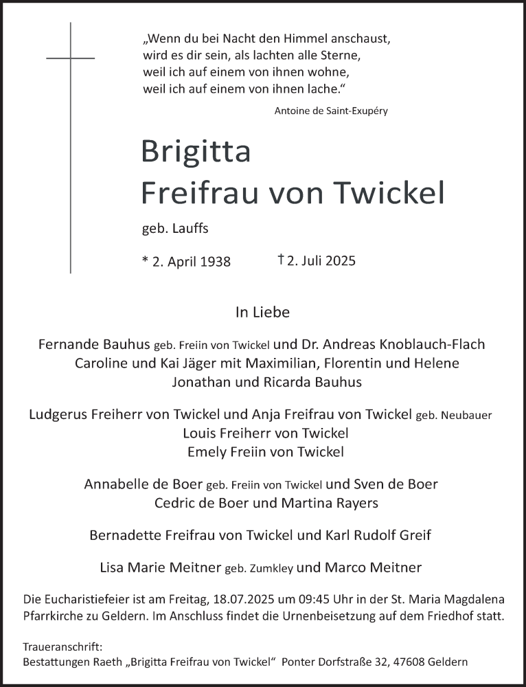 Hier finden Sie alle Traueranzeigen aus der Zeitung, die bisher für Brigitta Freifrau von Twickel erschienen sind. Weitere Traueranzeigen, die in der Zeitung erscheinen, werden hier ebenfalls aufgelistet