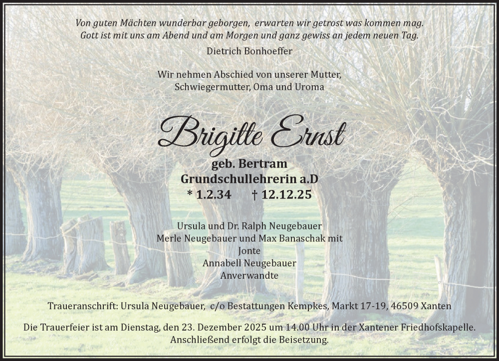 Hier finden Sie alle Traueranzeigen aus der Zeitung, die bisher für Brigitte Ernst erschienen sind. Weitere Traueranzeigen, die in der Zeitung erscheinen, werden hier ebenfalls aufgelistet