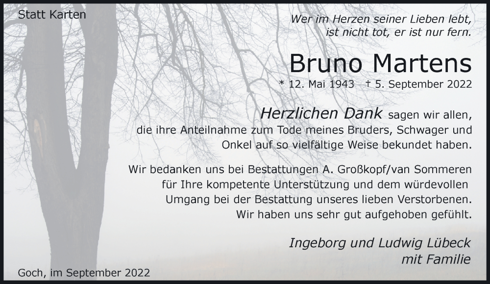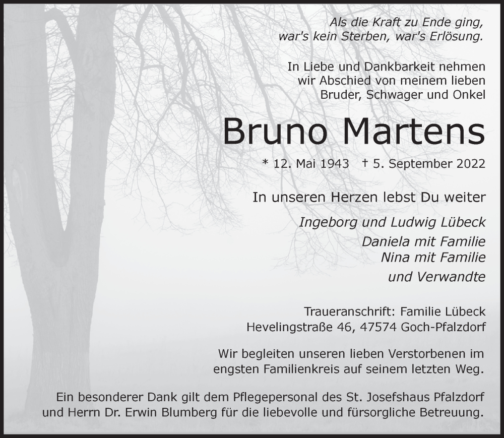 Hier finden Sie alle Traueranzeigen aus der Zeitung, die bisher für Bruno Martens erschienen sind. Weitere Traueranzeigen, die in der Zeitung erscheinen, werden hier ebenfalls aufgelistet